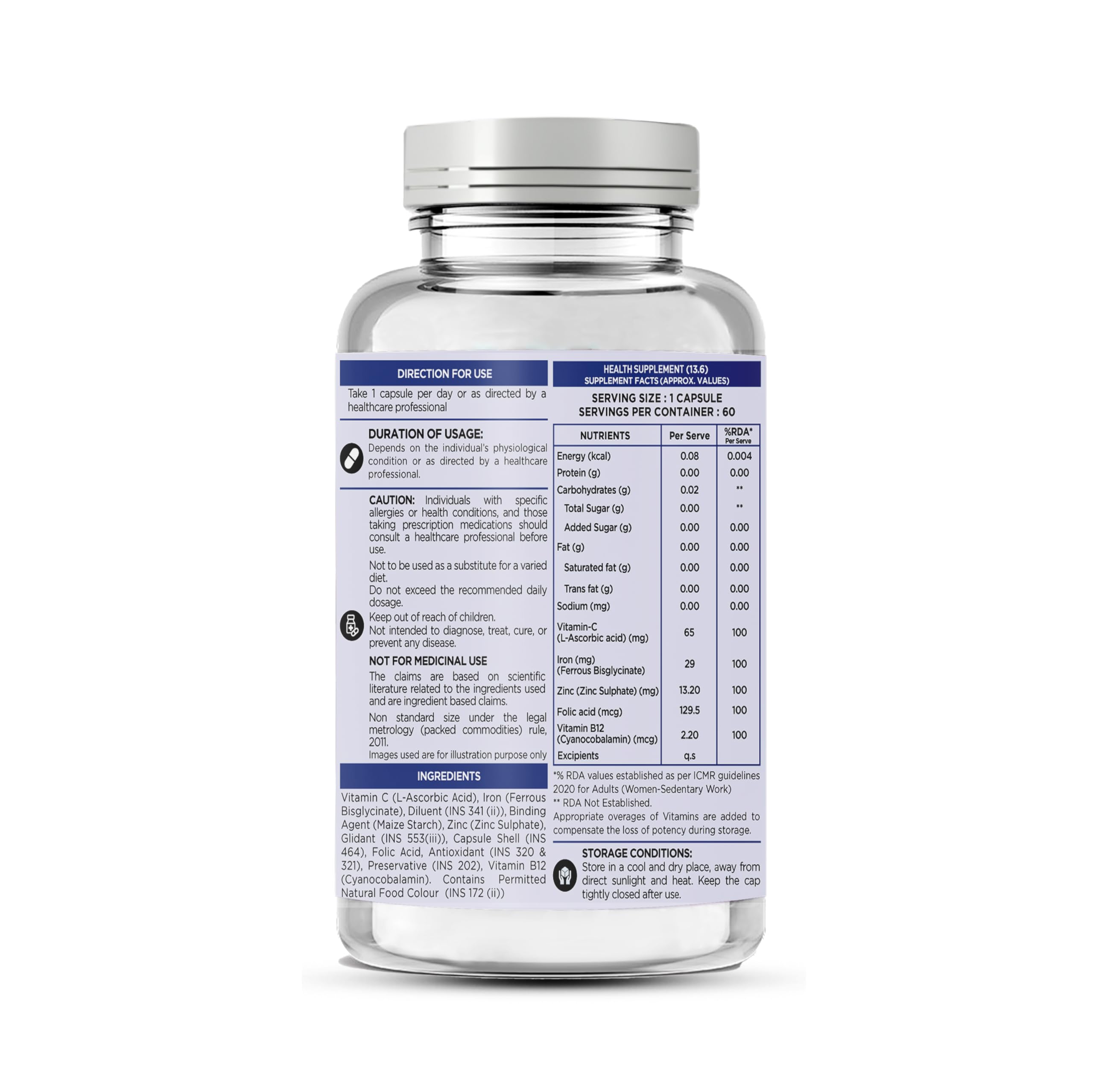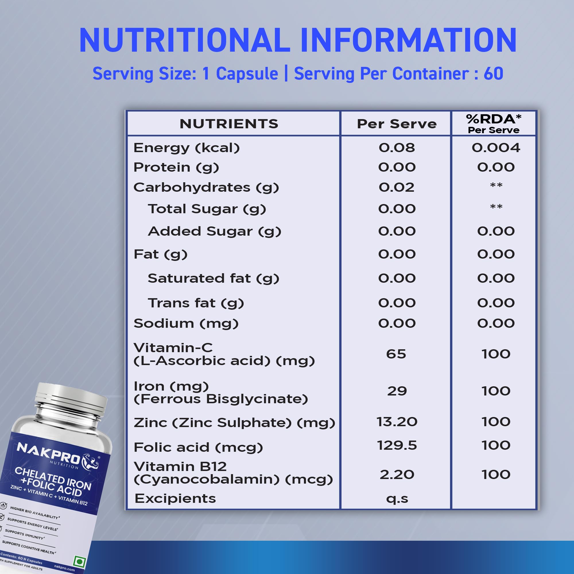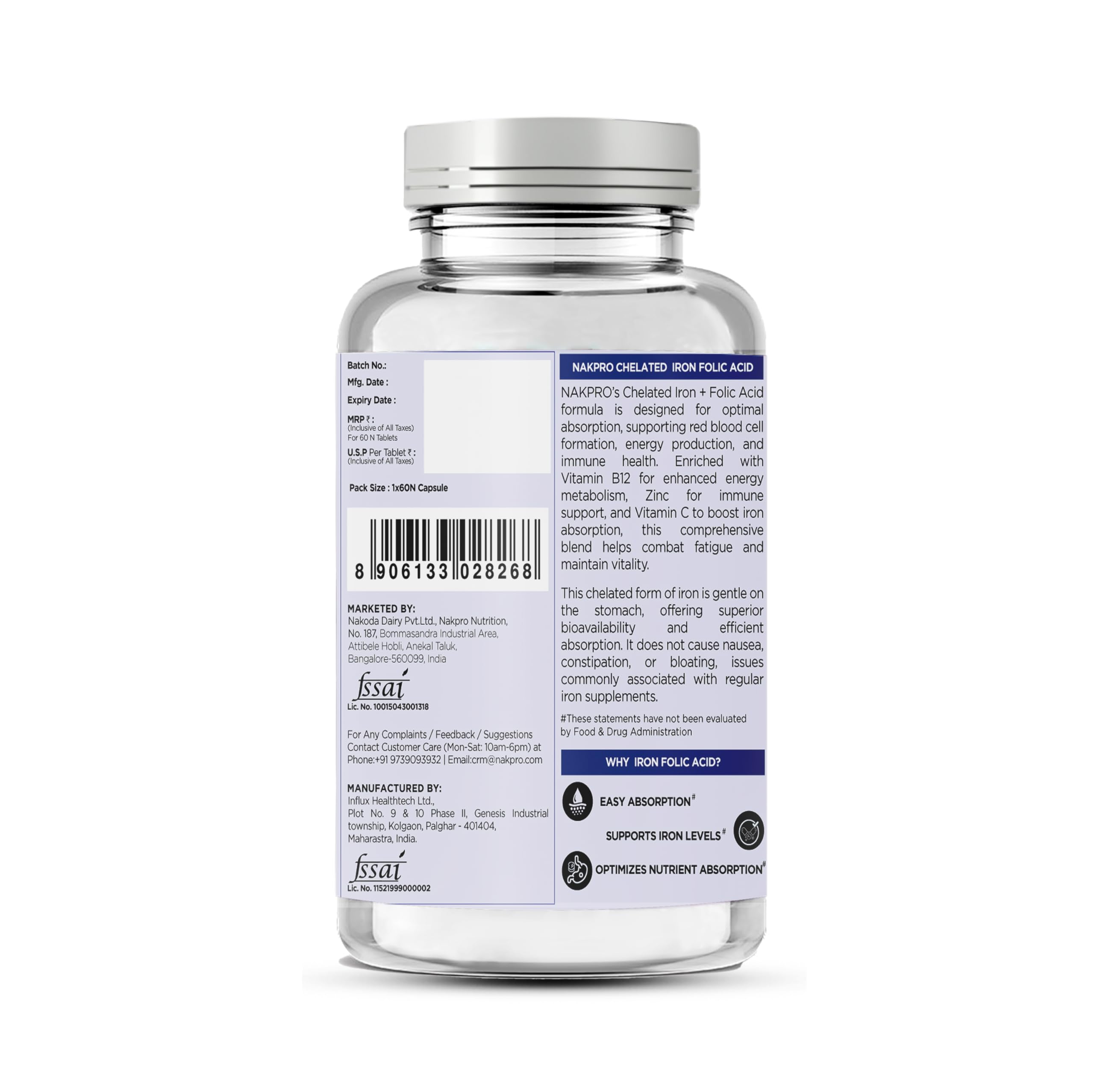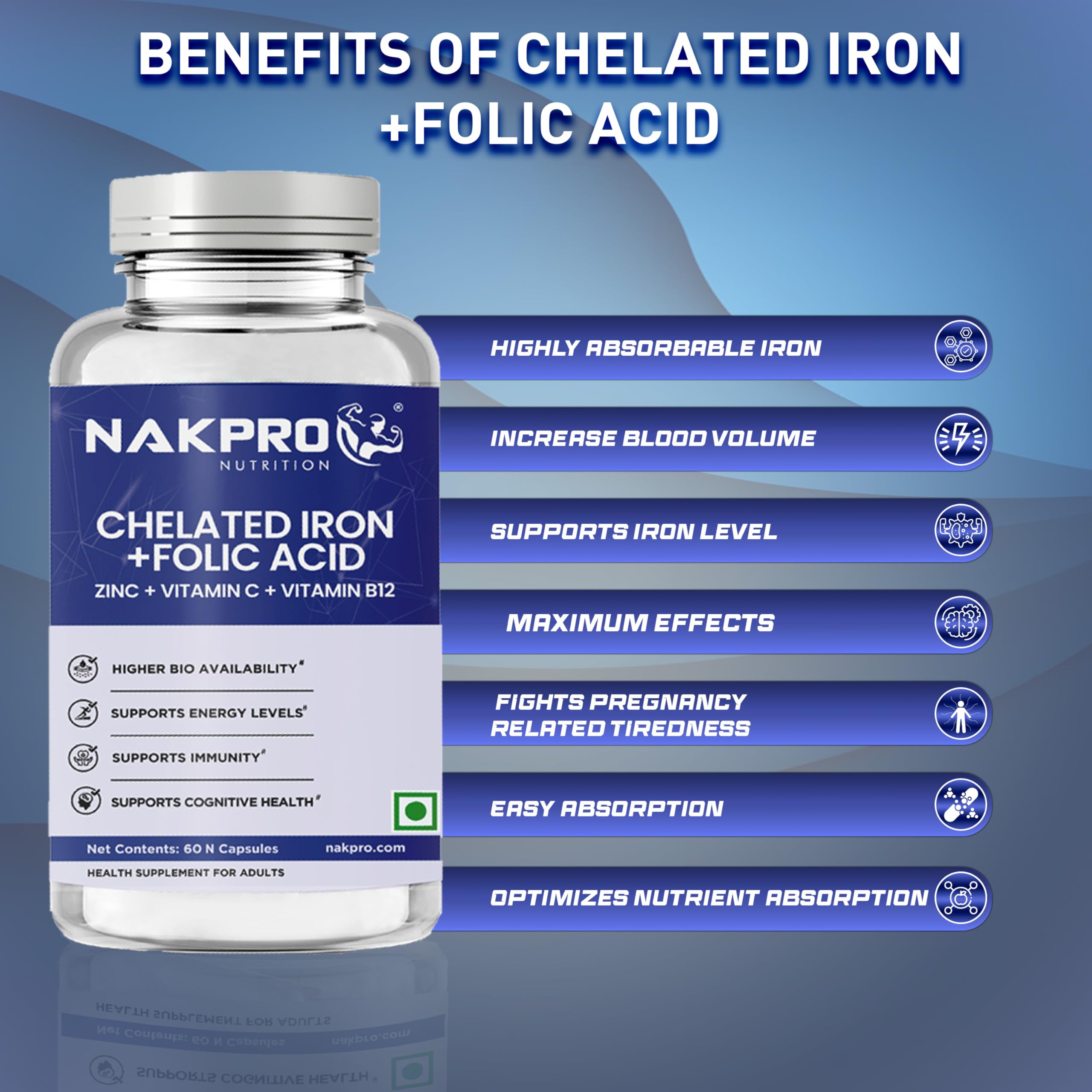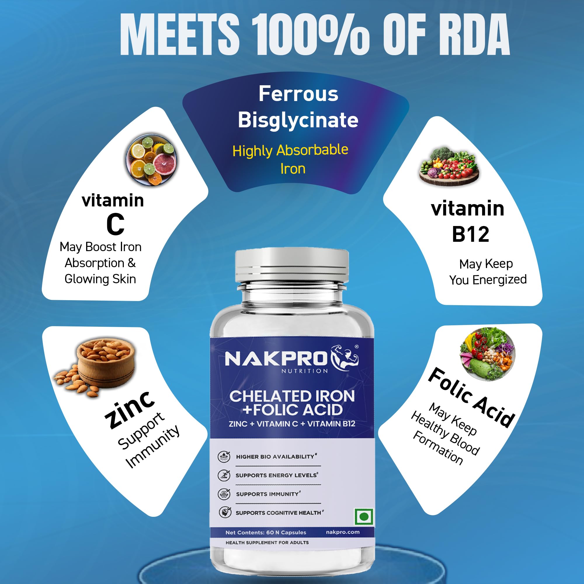 NAKPRO Chelated Iron Folic Acid Supplement, 6 Veg Capsules | With Vitamin C, Zinc & Vitamin B12 | Hemoglobin Booster, Supports Immunity & Energy
