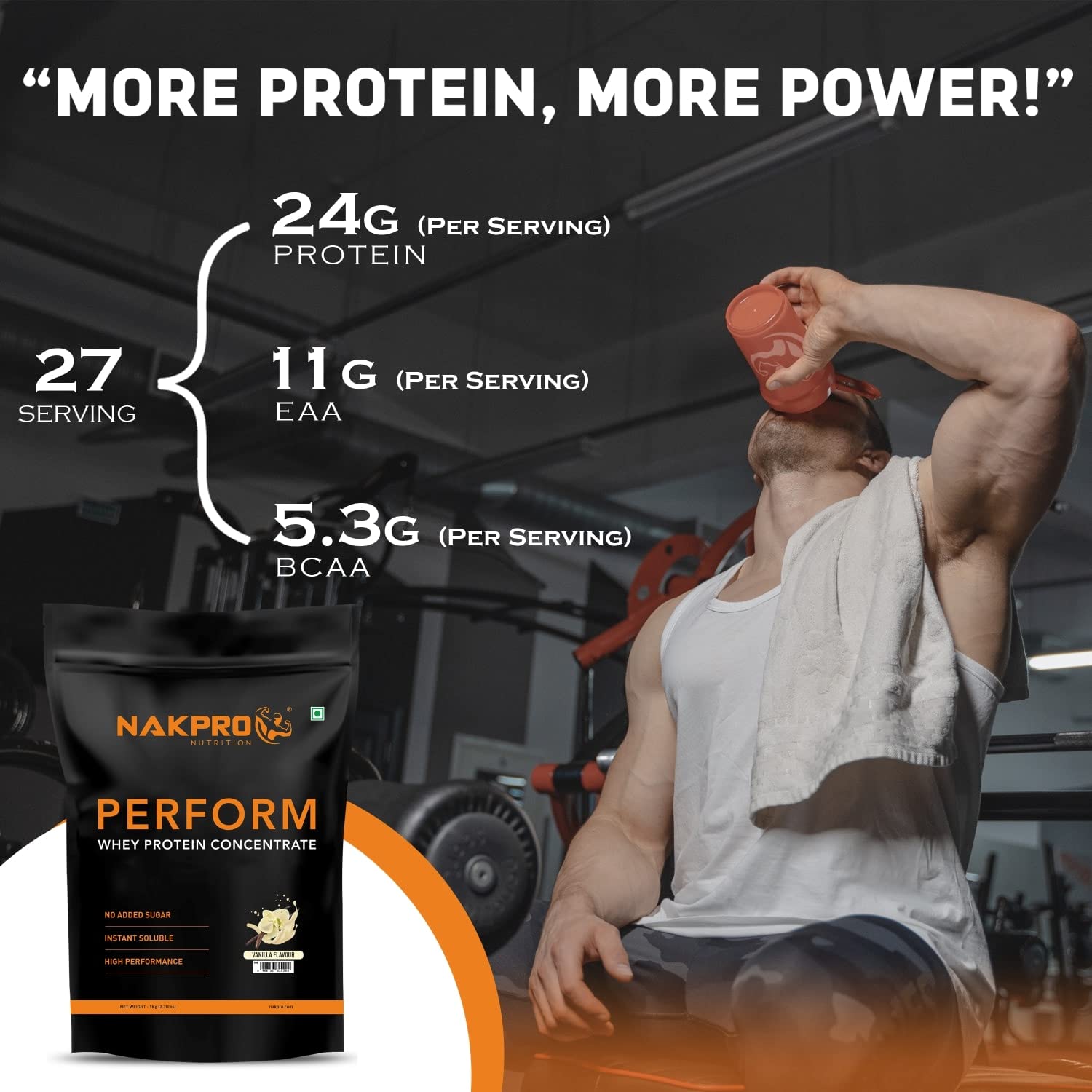 NAKPRO Perform Whey Protein Concentrate | 24g Protein, 5.3g BCAA per Serving | Muscle Recovery Workout Drink, Lean Muscle Growth (Vanilla, 1 Kg)