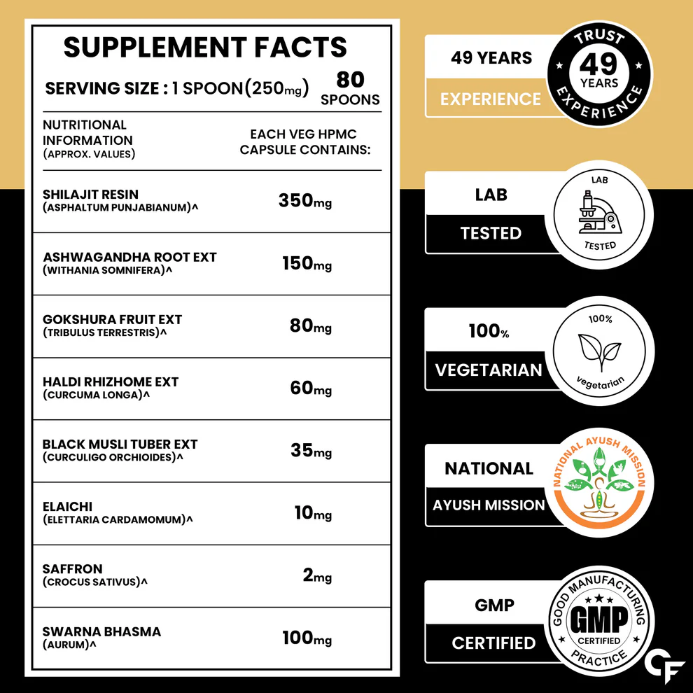 - ✅ 𝗥𝗜𝗚𝗢𝗥𝗢𝗨𝗦𝗟𝗬 𝗧𝗘𝗦𝗧𝗘𝗗 – 𝗣𝗥𝗘𝗠𝗜𝗨𝗠 𝗤𝗨𝗔𝗟𝗜𝗧𝗬 - Unlike other shilajit for men capsule, shilajit tablets for men, this shilajeet gold original is made using only Grade A pure shilajit & 24 Carat Gold. This formula is free from artificial additives, chemicals & preservatives. Every batch of sheelajit is carefully tested to ensure purity, safety and authentic Ayurvedic benefits.