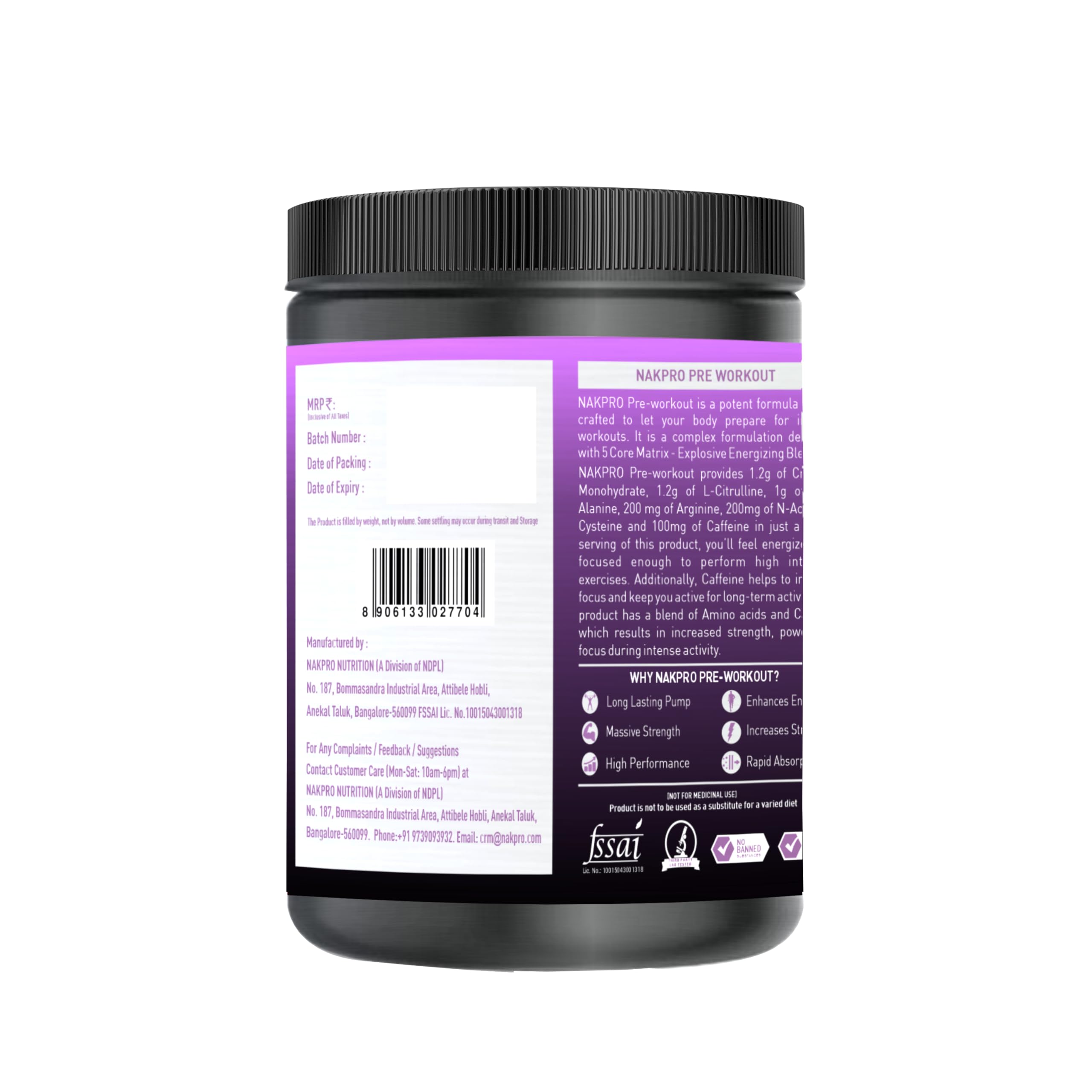 Nakpro Pre Workout Supplement Powder - JAR | 1mg Caffeine, 1.2g Creatine Monohydrate and 1.2g L-Citrulline helps in Lean Muscle Building (Blueberry, 15g)