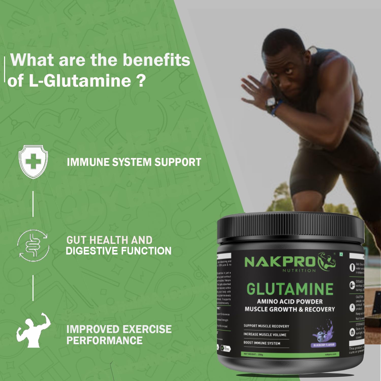 Nakpro L-Glutamine Powder - JAR | 4g Glutamine Per Serving, 5 Servings | Post Workout Amino Acid Protein Supplement for Muscle Growth and Recovery (Blueberry, 25g)