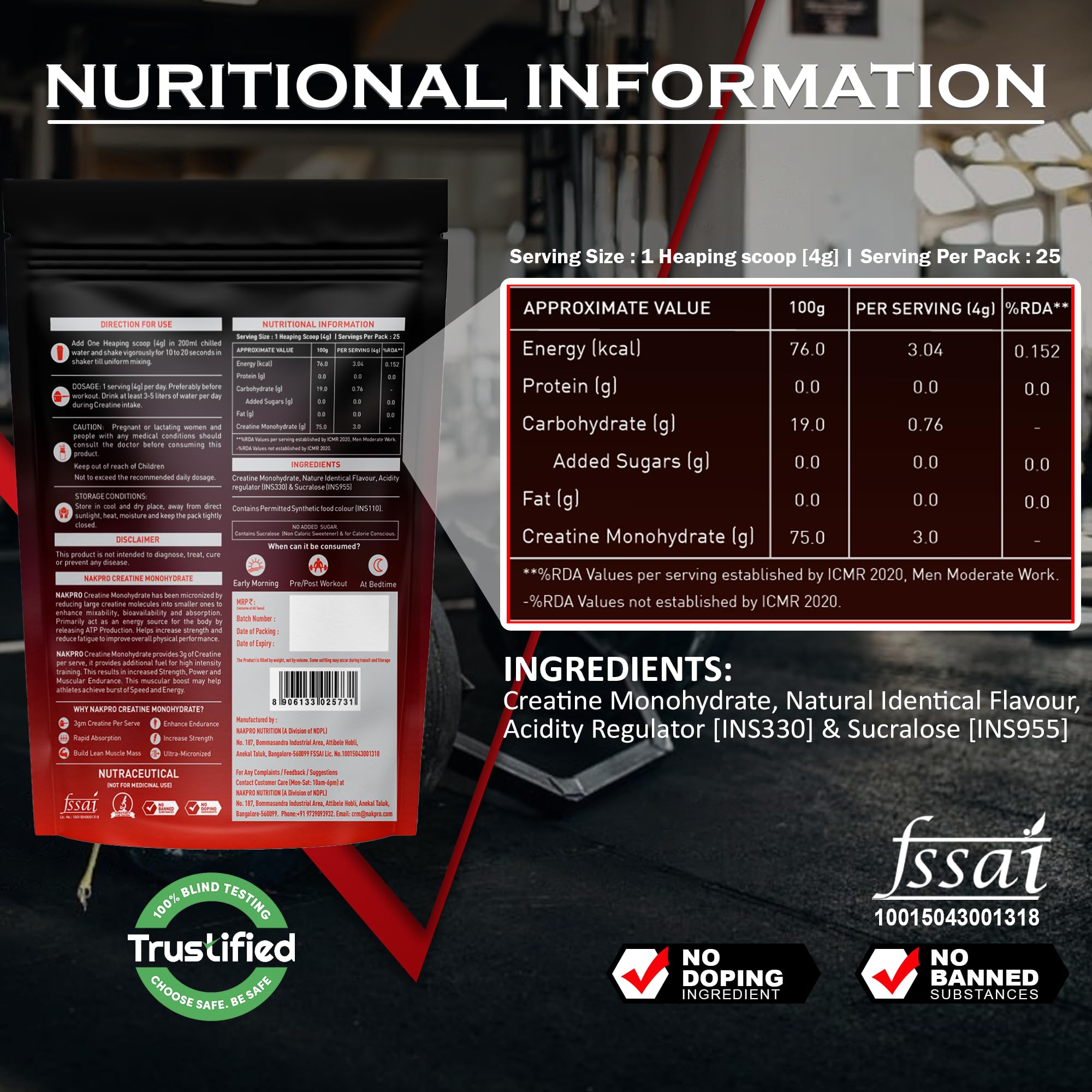 NAKPRO Micronised Creatine Monohydrate 1g powder, Tangy Orange- (25 Servings) | Trustified Certified | Rapid Absorption Pre/Post Workout Supplement for Muscle Repair & Recovery