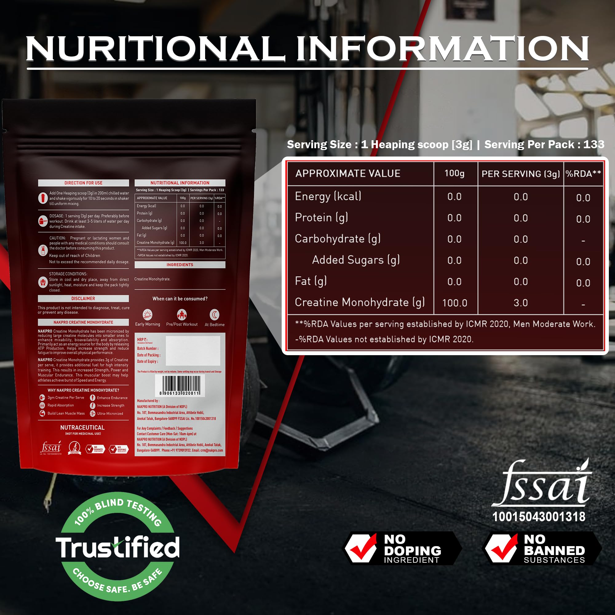 NAKPRO Micronised Creatine Monohydrate 4g powder, Unflavoured- (133 Servings) | Trustified Certified | Rapid Absorption Pre/Post Workout Supplement for Muscle Repair & Recovery