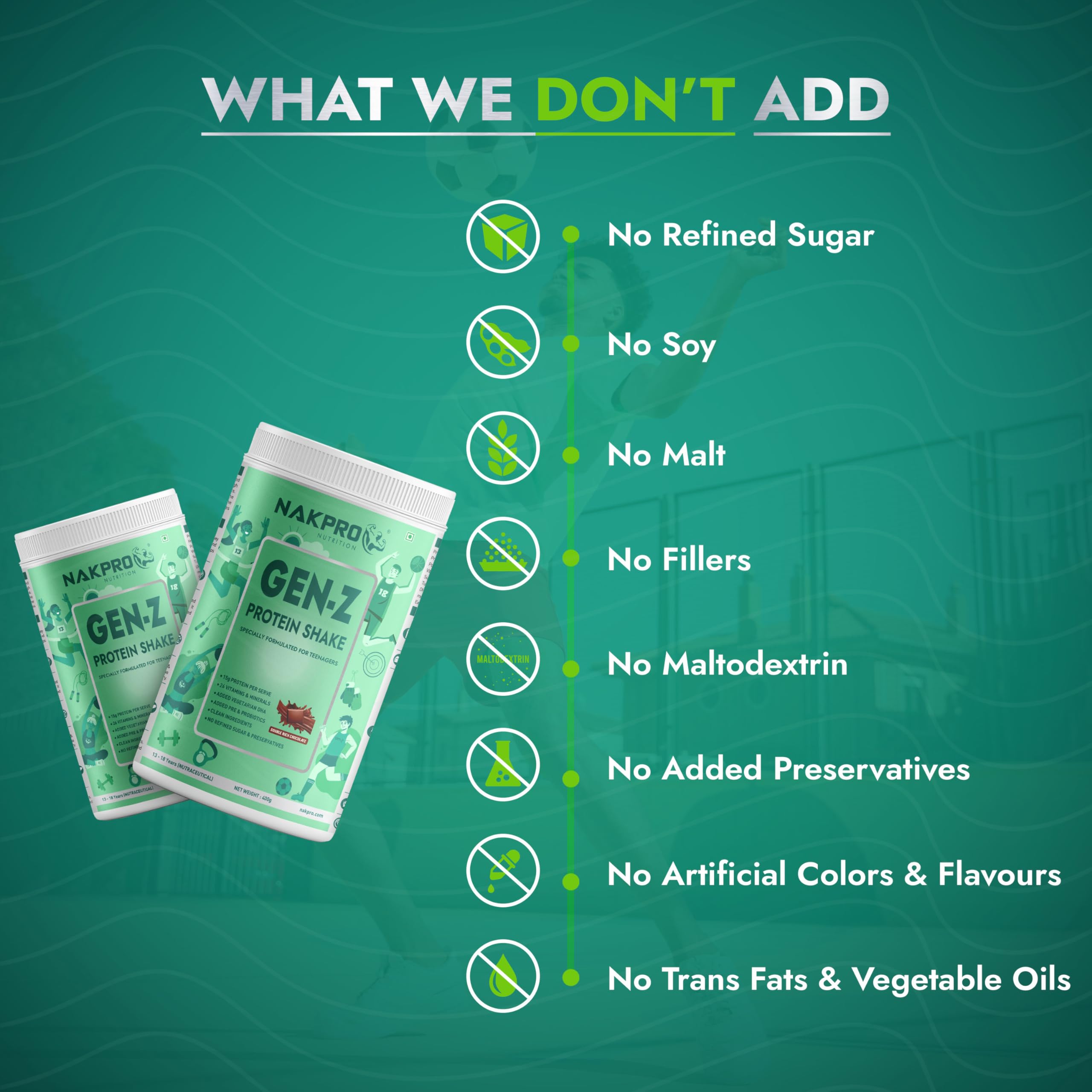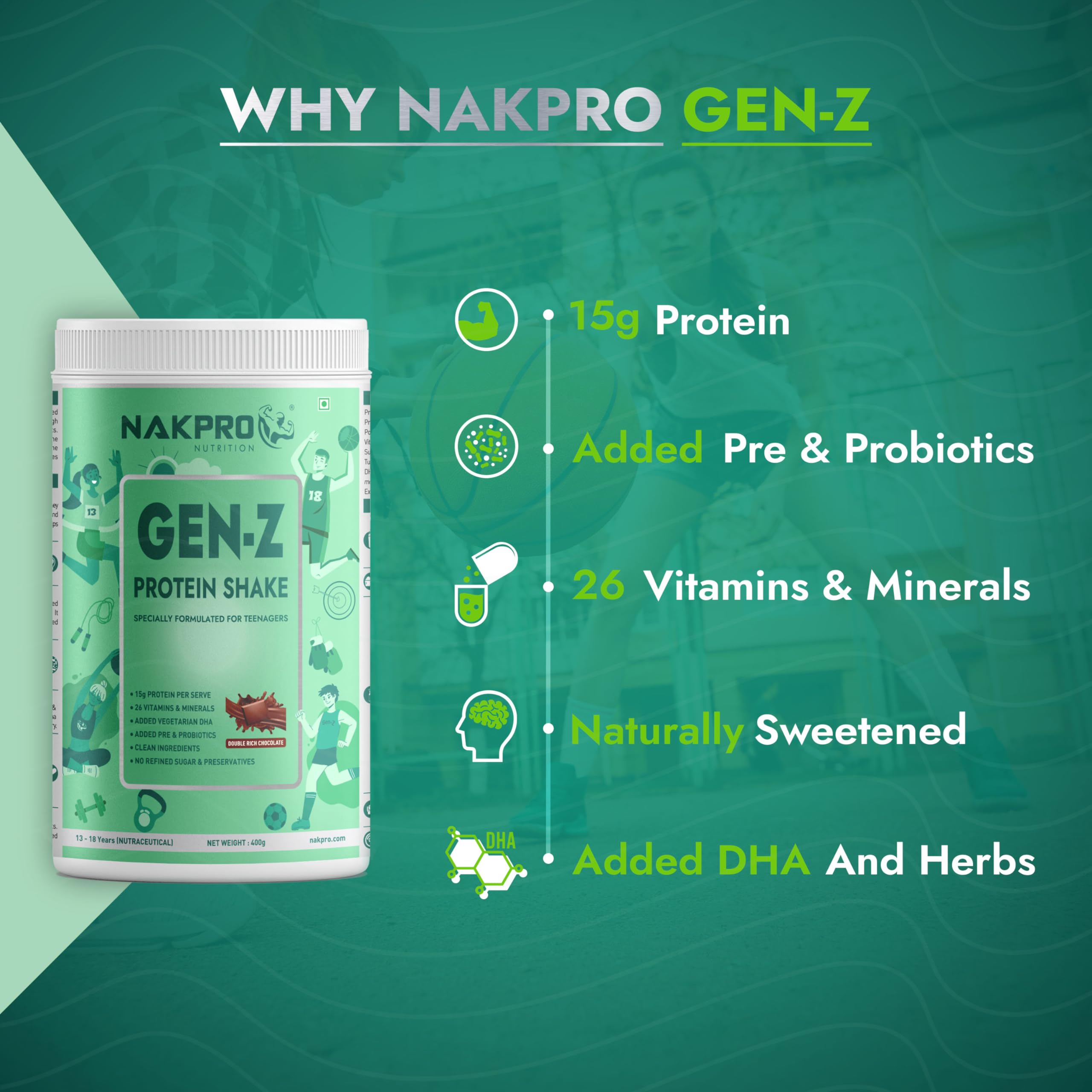 NAKPRO GenZ Protein Powder for Teens (13+), 15g Protein, Double Rich Chocolate - 4g | Vitamins & Minerals, Supports Immunity, Strong Bones & Height