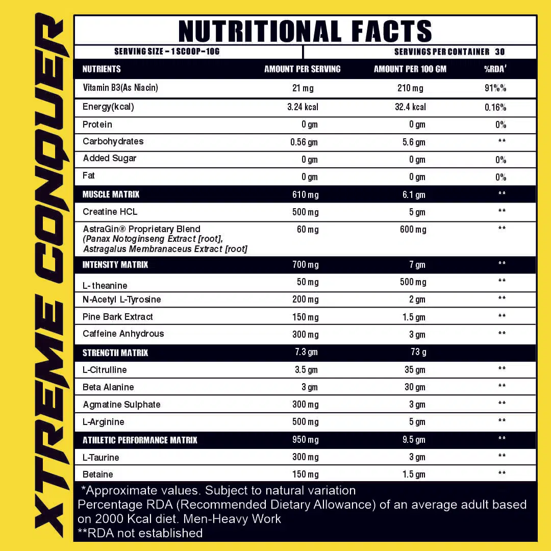 Suggested Use:- As a dietary supplement, take 1 scoop of Pre-workout Conquer with 150-250ml of water. Consume 15-20 minutes prior to exercise. Do not exceed the daily & stated recommended d usage.