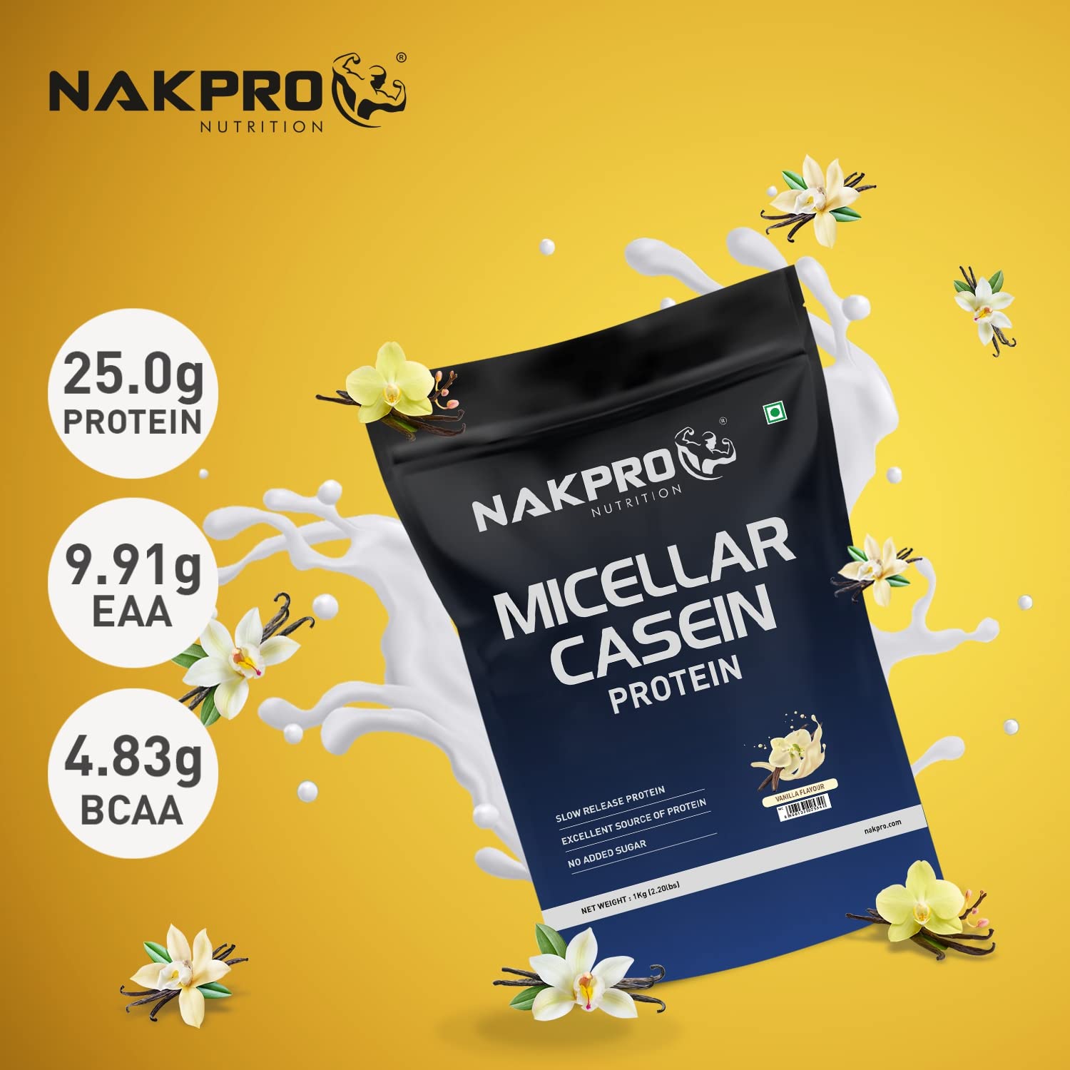 NAKPRO 1% Micellar Casein Protein Supplement |25g Protein, 9.91g EAAs, 4.83g BCAAs| Slow Absorbing Micellar Casein Protein Powder (Vanilla, 2 Kg)