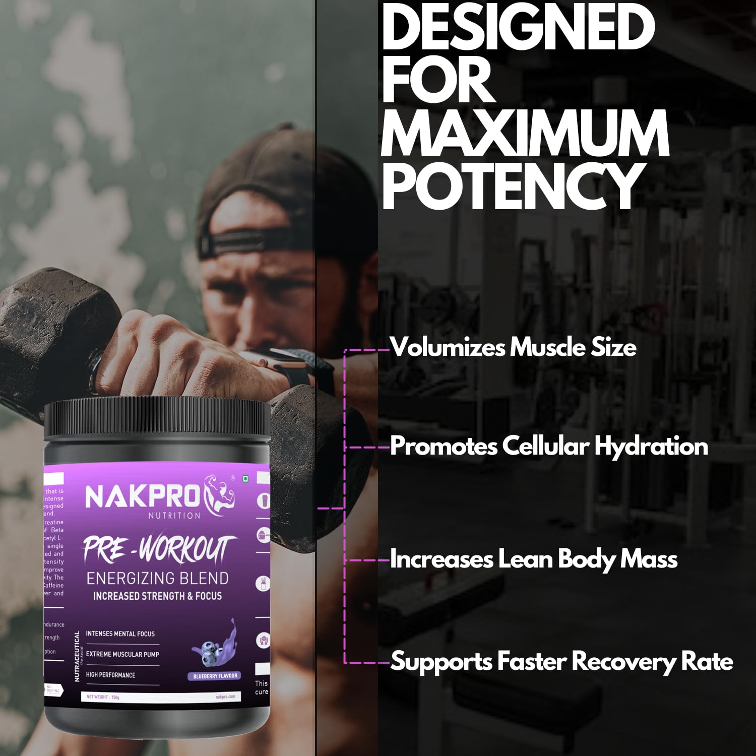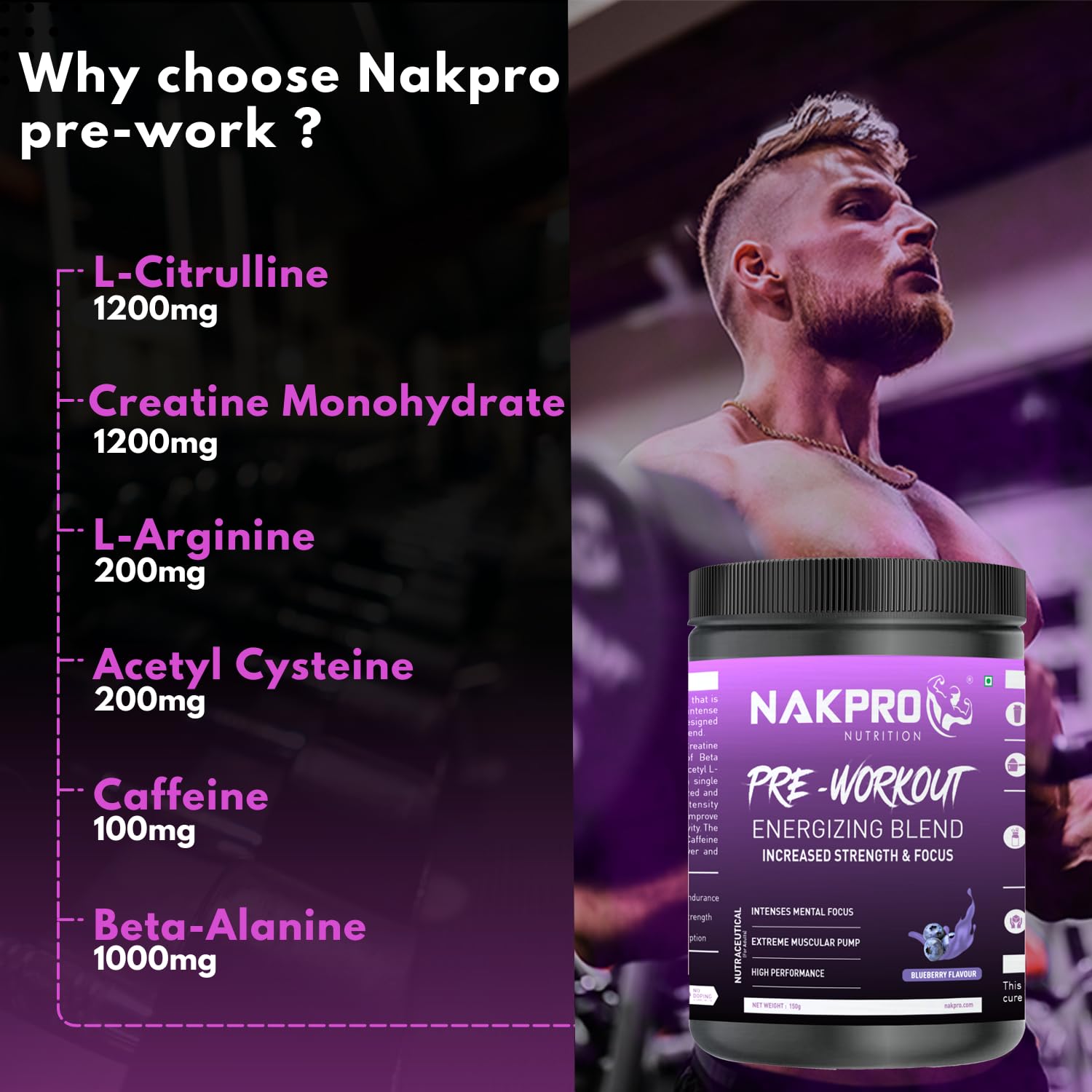 Nakpro Pre Workout Supplement Powder - JAR | 1mg Caffeine, 1.2g Creatine Monohydrate and 1.2g L-Citrulline helps in Lean Muscle Building (Blueberry, 15g)