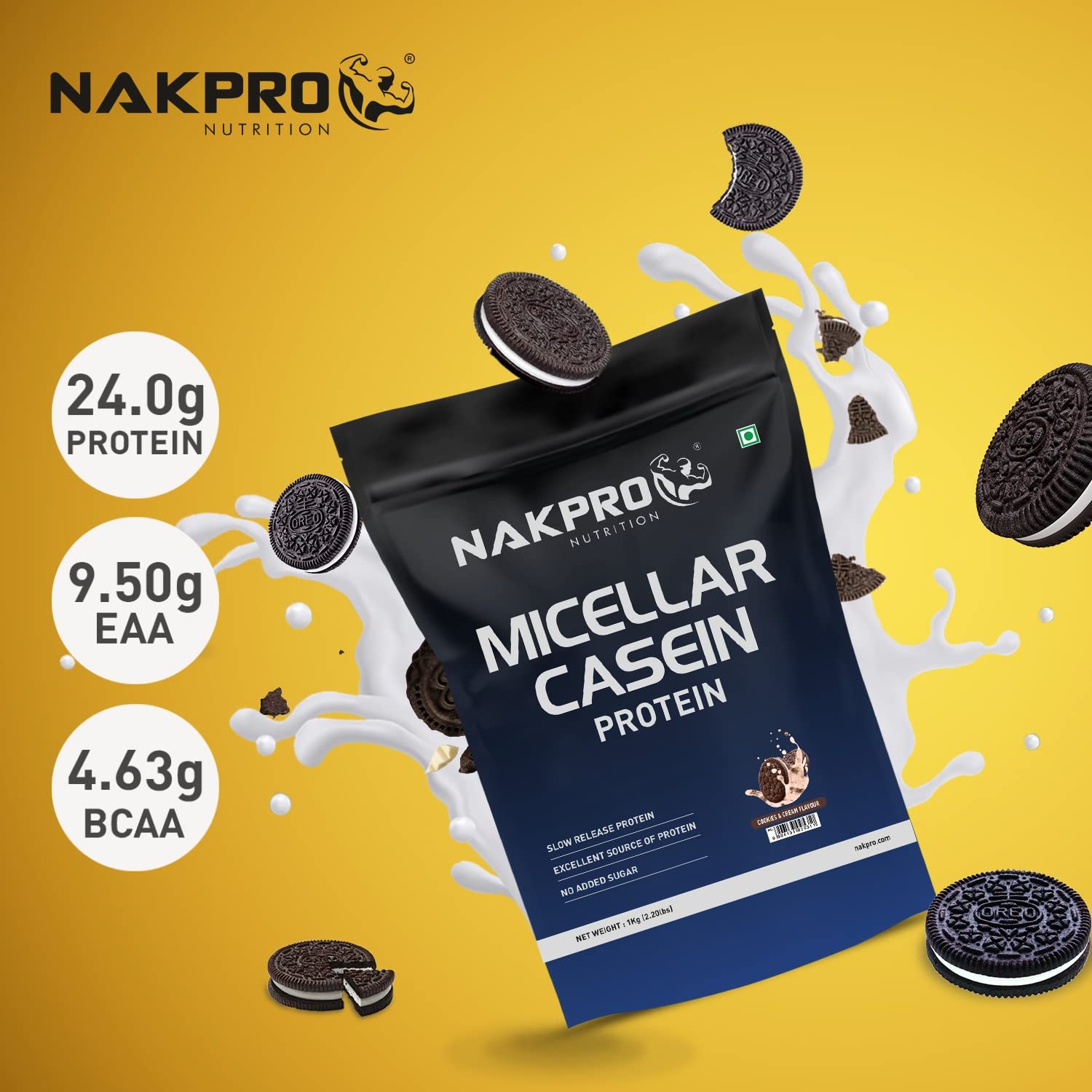 NAKPRO 1% Micellar Casein Protein Supplement |24g Protein, 9.5g EAAs, 4.63g BCAAs| Slow Absorbing Micellar Casein Protein Powder (Cookies & Cream, 2 Kg)