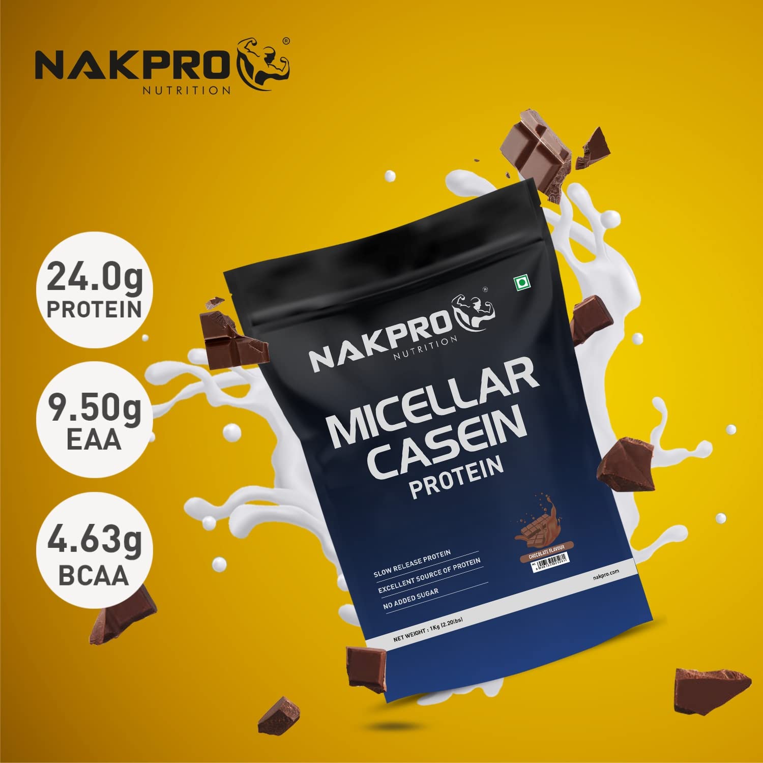 NAKPRO 1% Micellar Casein Protein Supplement |24g Protein, 9.5g EAAs, 4.63g BCAAs| Slow Absorbing Micellar Casein Protein Powder (Chocolate, 1 Kg)