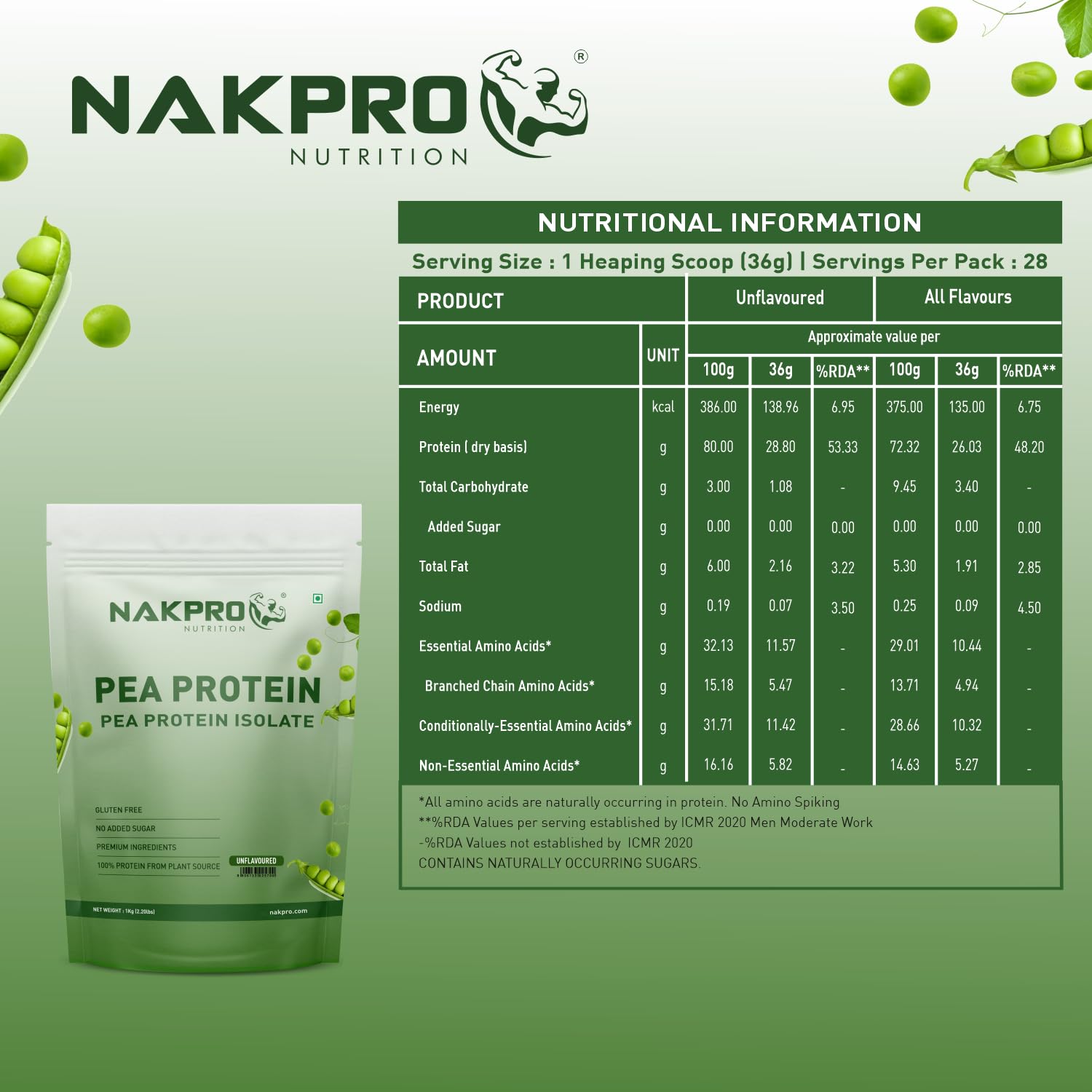 NAKPRO 1% Pea Protein Isolate, Unflavoured - 1kg | 28.8g Protein, 5.5g BCAA | Natural Vegan Plant Protein Powder | Easy To Digest | All Essential Amino Acids for Muscle Gain and Recovery